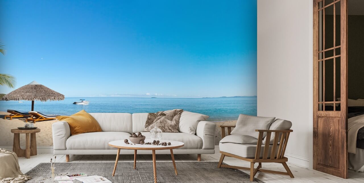 Stunning Panoramic Tropical Beach wall mural from Wallsauce. This high quality Panoramic Tropical Beach wallpaper is custom made to your dimensions. Easy to order and install .