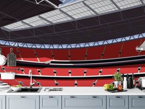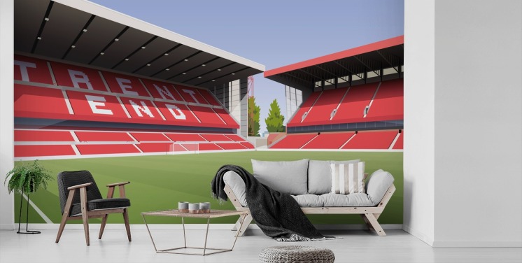 mural rojo y verde de un estadio de fútbol llamado Anfield Football Stadium de Matthew J I Wood Diseño e ilustración para dormitorio infantil