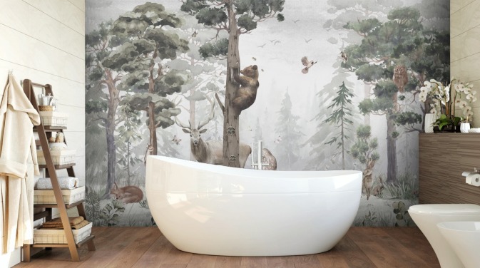 mural infantil de papel pintado forestal personalizable en verde, blanco y marrón llamado In the Middle of the Forest de Ms. Tiff para guarderías y dormitorios
