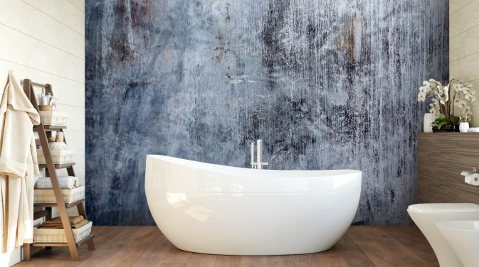 mural de papel pintado azul con efecto hormigón para cocinas y salas de estar de Wallsauce