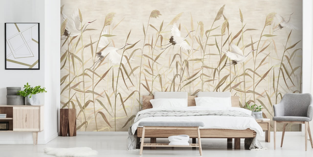 Crea calma y tranquilidad en tu hogar con este mural de papel pintado a medida de The Reed Birds de Wallsauce.com.