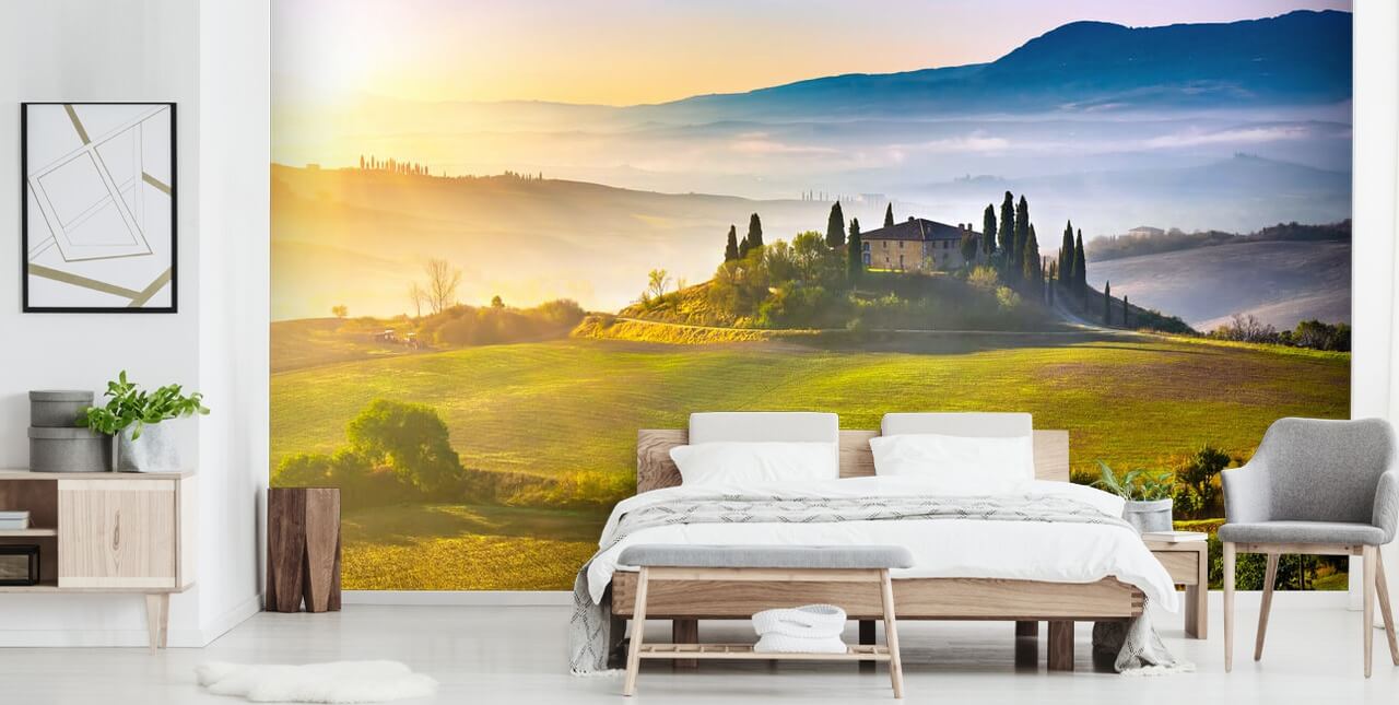 Transforme el diseño interior de su hogar con este papel pintado a medida de la Toscana al amanecer. Ideal para una hermosa sala de estar, dormitorio, baño y más.