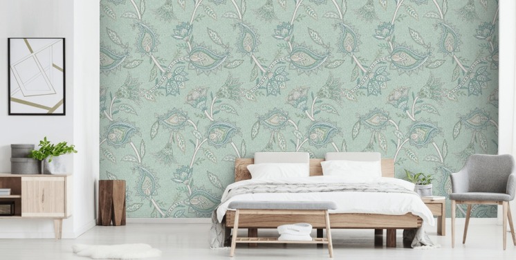mural de papel pintado floral beige y verde claro llamado Meadow de Marina Stupakova para dormitorios