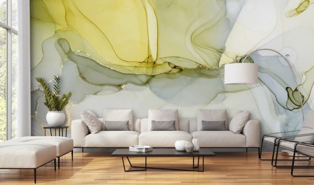 mural de papel pintado de pintura abstracta blanca, amarilla y gris llamado Pintura gris y amarilla para dormitorios y salas de estar