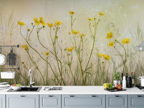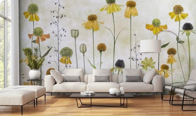 mural de papel pintado floral verde y amarillo llamado Good Morning Flowers by 1x para dormitorios, salas de estar y comedores