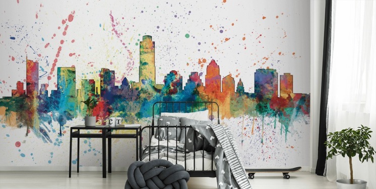 mural del horizonte de Austin, Texas, con salpicaduras de pintura