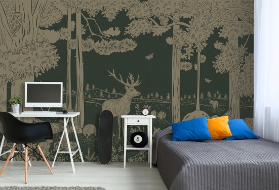 mural de papel pintado de bosque verde oscuro llamado Monochrome Forest - Vintage Green de Kikki Belle para dormitorios y guarderías infantiles