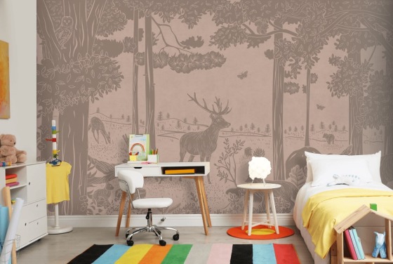 mural de pared rosa para niños llamado Monochrome Forest - Vintage Pink de Kikki Belle para dormitorios y guarderías