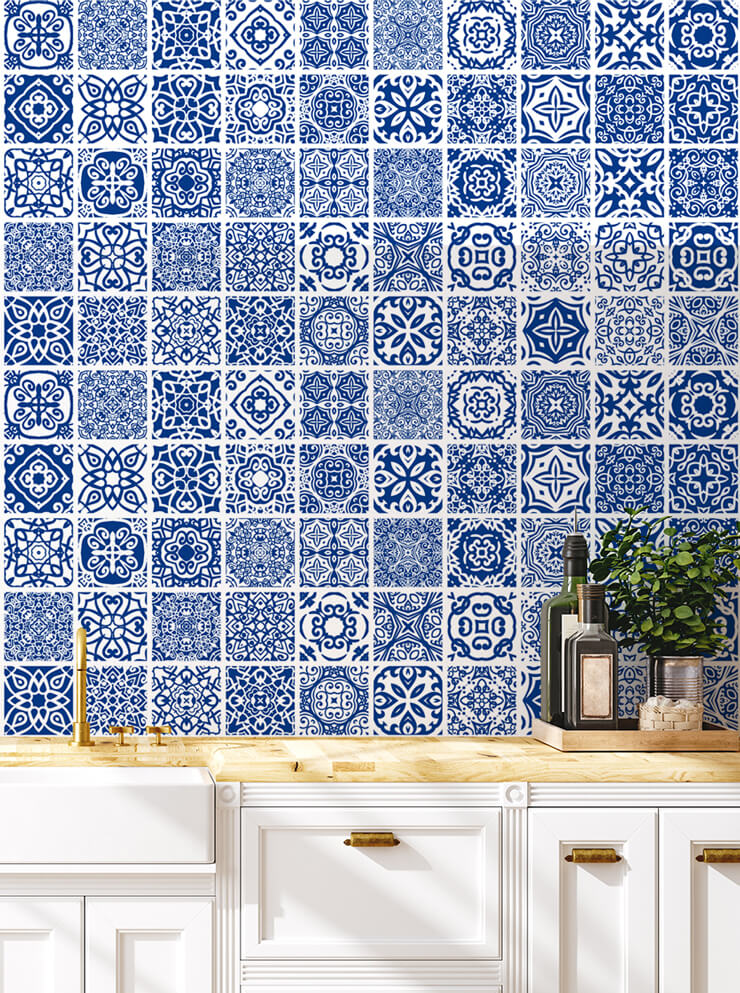 blue and white tile wallpaper in kitchen