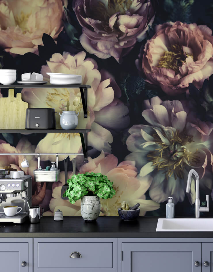 dark floral wallpaper in kitchen