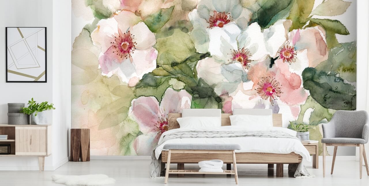 Reminiscent of white poppies, this gorgeous Floral Colourway wallpaper is utterly pretty! This is why we think it would make a fabulous feature wall in a gorgeous bedroom! This watercolour wallpaper is a different way of bringing nature indoors. Pair it with pastel pink or sage-green painted surrounding walls, white and pink bedding and always try to keep pink and white fresh or faux flowers in the room.