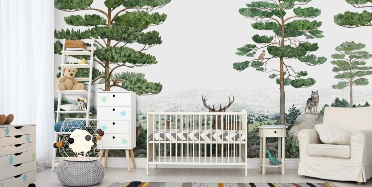 customisable children's wall mural called Mountain Forest by Kikki Belle for bedrooms