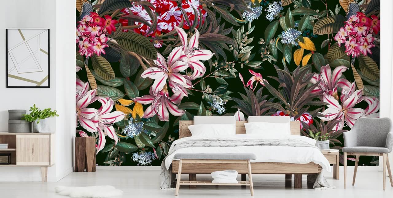 Bring colour to your walls with this made-to-measure Lilly Jungle wallpaper mural from Wallsauce. The perfect floral wallpaper for an exotic bedroom, living room or bathroom.