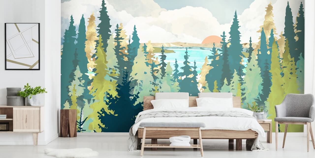 Place this gorgeous green landscape wallpaper on the wall in your serene bedroom behind the headboard of your bed… Bring out those touches of gold by choosing furniture and décor with gold or brass elements. Doors and drawer handles, a lamp or even a gold ornament! Just order by calling us or filling out the form on this page.