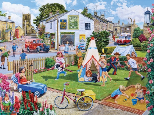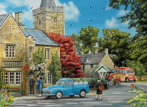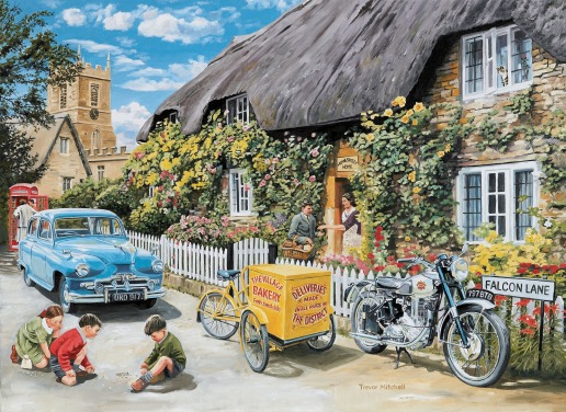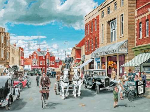 colourful bygone era wallpaper mural called The Village High Street by Trevor Mitchell for care homes