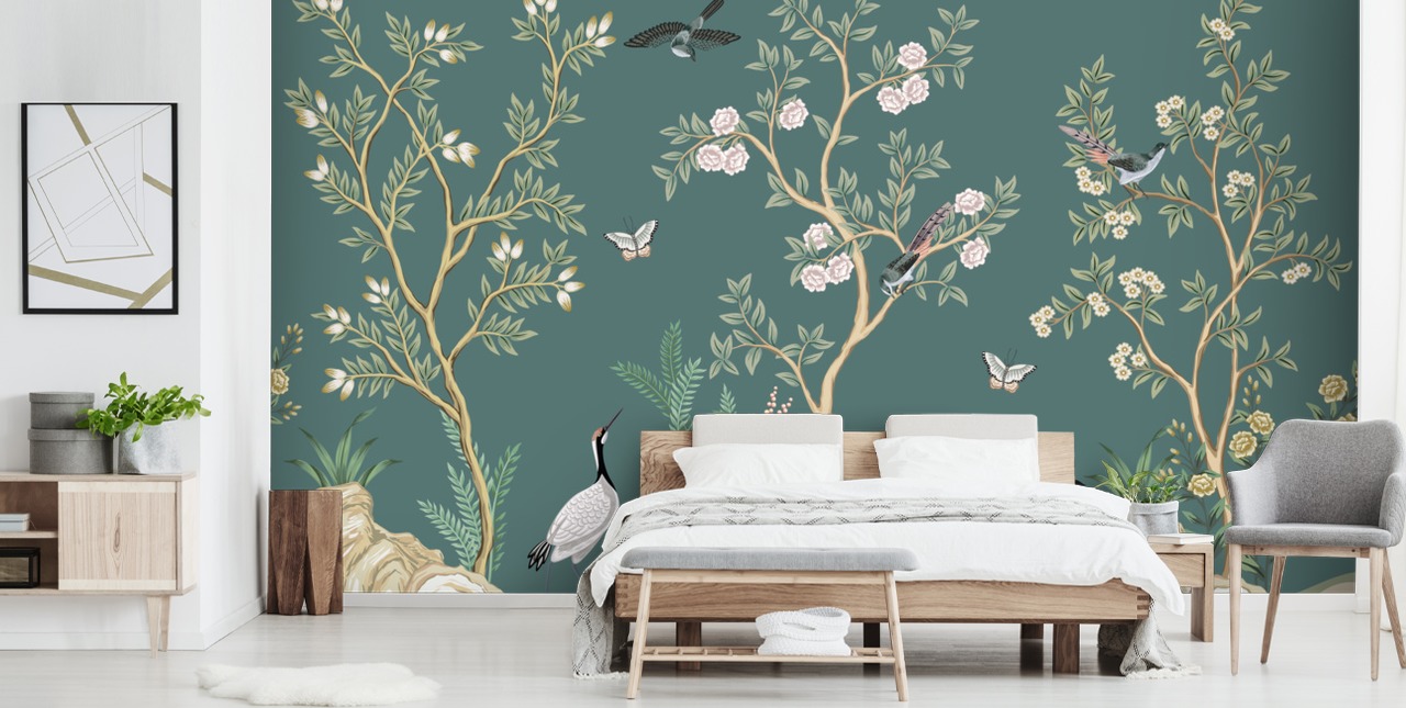 The Green Chinoiserie Rose Garden wallpaper is a beautiful mural that will completely transform a bedroom, living room or bathroom wall. The gorgeous pattern and bold colour makes this an eye-catching design that is sure to liven up any space.
