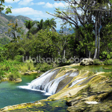 green waterfall wallpaper called Forest Waterfall at Wallsauce for bedrooms, bathrooms and offices