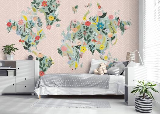 light pink floral world map wallpaper