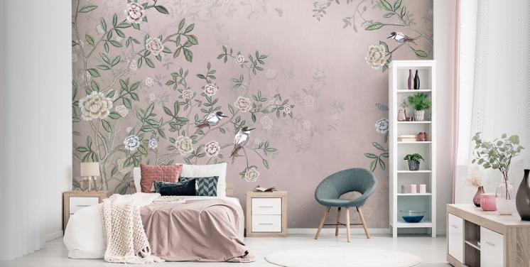 chinoiserie wallpaper mural with roses and birds
