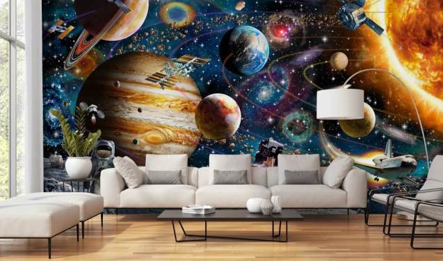 Adrian Chestermanin mukautettava avaruuden taustakuvamaalaus nimeltä Space Odyssey lapsen makuuhuoneeseen