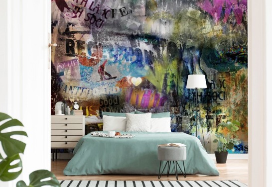 värikäs muokattava graffiti-taustakuvamaalaus nimeltä Grunge makuuhuoneisiin