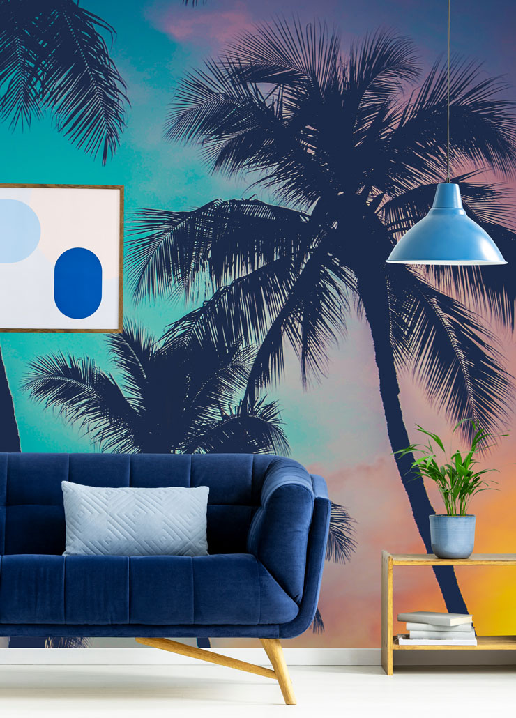 Tapetit eivät enää ole sisustuksessa vain jälkikäteen ajateltu asia, vaan usein ne ovat huoneen keskeinen piirre ja keskipiste. Tänä vuonna olemme nähneet talojen heräävän täysin henkiin rohkeilla painatuksilla ja maisemallisilla seinäkuvioilla. Tämä Havaijin palmupuiden auringonlasku-maalaustapetti on täydellinen esimerkki näyttämön asettamisesta. Se on unenomainen tausta mihin tahansa asuin- ja ruokailutilaan - tai se voi auttaa luomaan rauhoittavan tunnelman makuuhuoneeseen.