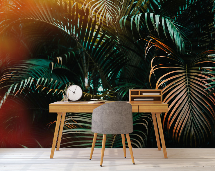 Tee kotitoimistostasi rauhoittava, luova ja inspiroiva työpaikka. Tämä tumma Palm Leaves -seinämaalaustyö on täysin rauhoittava ja täydellinen tausta aivoriihelle. Hyvä sisustus voi paitsi parantaa tuottavuutta myös tukea mielenterveyttä. Kasvit ovat ehdottomasti oikea tapa tehdä se, ja palmutaustakuva on sellainen kasvi, jota ei tarvitse kastella.