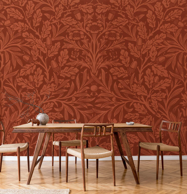 Jos haluat mennä askeleen pidemmälle oranssin tapetin kanssa, miksi et valitsisi jotain tämän Tammenterhot ja tammenlehdet -maalauksen kaltaista? Kuten näet, koristeellinen poltetun oranssi tapetti tuo paljon lisää neutraaliin ympäristöön. Vaikka se tuo mieleesi syksyiset oranssit lehdet ja pudonneet käpyruusut, se toimii yhtä hyvin myös helteellä ja saa sinut ajattelemaan dramaattisia oransseja auringonlaskuja keskikesällä... Luota meihin. Iloinen, lämmin ja rohkea oranssi tapetti voi tuoda kotiin niin paljon.