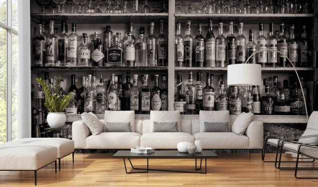mustavalkoiset pullot hyllyllä baarin taustakuvan takana
