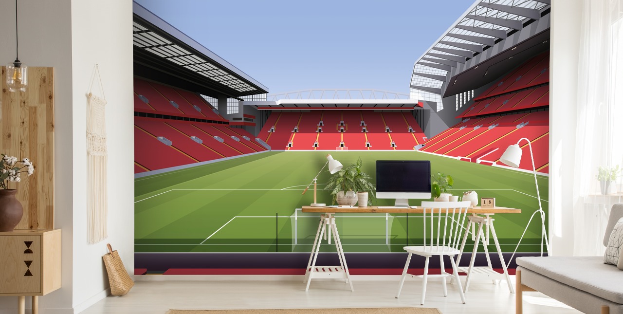 Mo Salahista Steven Gerrardiin Anfield on ollut koti joillekin maailman suurimmista jalkapalloilijoista. Jos sinulla on lapsi, joka on Liverpool-fani, joka tarvitsee uutta makuuhuoneen sisustusta, upea Anfield Football Stadium -taustakuva on täydellinen heille!