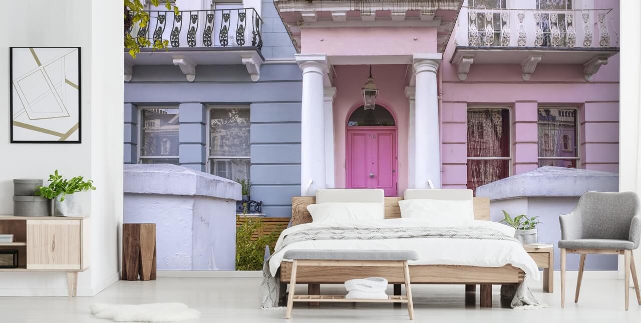 Upea Notting Hill Colourful House -seinämaalaus Wallsaucesta. Tämä korkealaatuinen taustakuva on räätälöity mittojen mukaan.