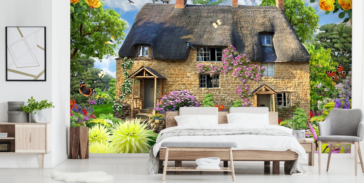 Bakers Cottage on Howard Robinsonin suunnittelema värikäs ja eloisa mökkitapettimaalaus, joka on ihanteellinen hoitokodeihin.
