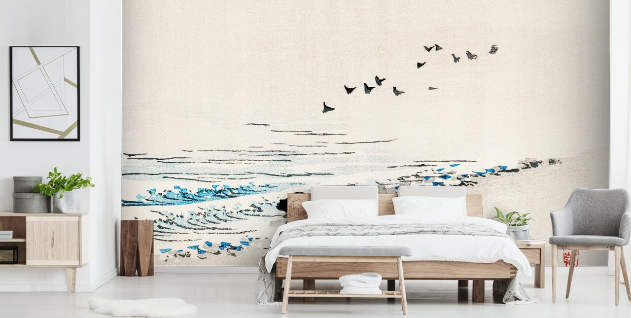 Koskatämä japanilainen taidetapetti on pääasiassa mustavalkoinen ja sinisen välkkyminen, valitse sisustus, joka täydentäisi näitä sävyjä. Miksi et lisää ylimääräistä sävyä, kuten punaista, jotta voit lisätä tilaa enemmän väriä?
