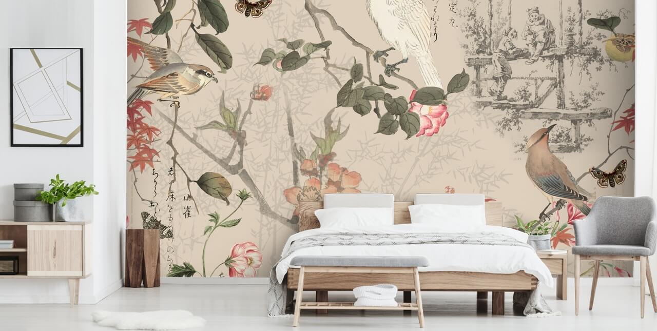 Rakastammetämän vintage-taustakuvan yksityiskohtia eksoottisista linnuista, perhoset ja kukat sekä Kiinan kesämökissä seisovat ihmiset.