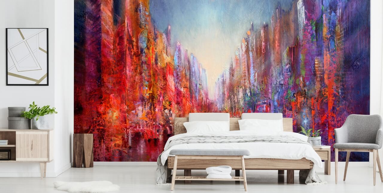 Annakotiisi taiteellinen makeover tällä abstraktilla City on the River -taustakuvalla. Täydellinen useimpiin asuintiloihin, tämä maalattu kaupungin taustakuva antaa kodin huoneelle uuden elämän vuokrauksen!