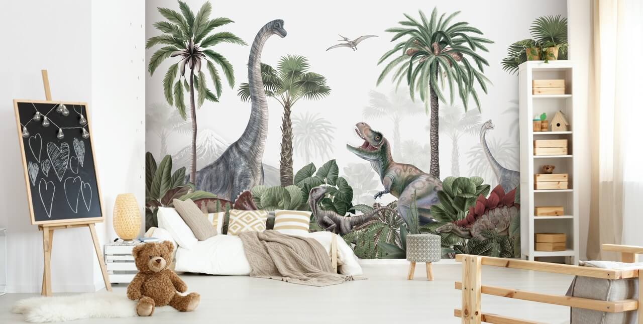 Luo hämmästyttävä dinosaurusominaisuusseinä lapsesi makuuhuoneeseen tällä mittatilaustyönä valmistetulla Dino Jive -taustakuvalla, jonka on suunnitellut Kikki Belle. Tämä hämmästyttävä lasten dinosaurustapetti näyttäisi upealta sijoitettuna seinälle sängyn vieressä.
