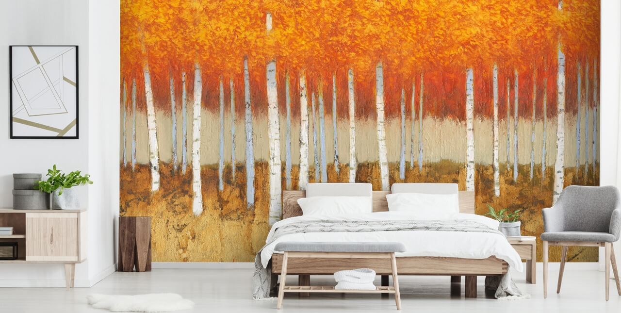 Annaseinillesi muodonmuutos tällä mittatilaustyönä tehdyllä Fall Birches -taustakuvamaalauksella. Tämä James Wiensin koivutaustakuva näyttäisi täydelliseltä naimisissa oranssin kokoelman kanssa, luonnonvalkoiset ja messinkäiset kultaiset tarvikkeet. Esimerkiksi, jos sitä käytetään luonnon inspiroimassa makuuhuoneessa, maalaa seinät luonnonvalkoisiksi ja sinulla on vuodevaatteet vastaamaan. Tuo väri oranssilla sirontatyynyillä ja kultaisella valaistuksella.