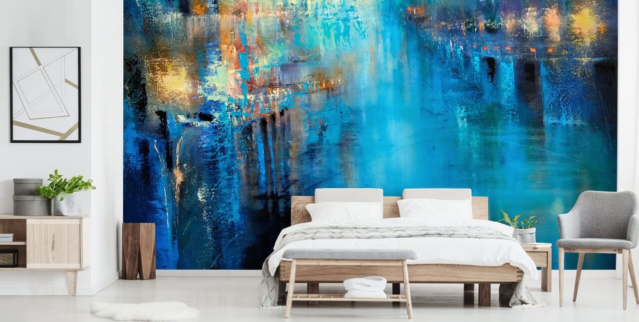 Suosittelemmeasentamaan tämän sinisen abstraktin taustakuvan seinälle päätysi takana. Tuoda esiin ne kiillotetut kullansävyt, valitse kullanvarren valaisimet, jotka sijoitetaan sängyn molemmille puolille. Valitse valkoiset pussilakanat, mutta niissä on valikoima kulta- ja sinisiä sirontatyynyjä, jotka heijastavat abstraktin seinämaalauksen rauhallisia sävyjä.