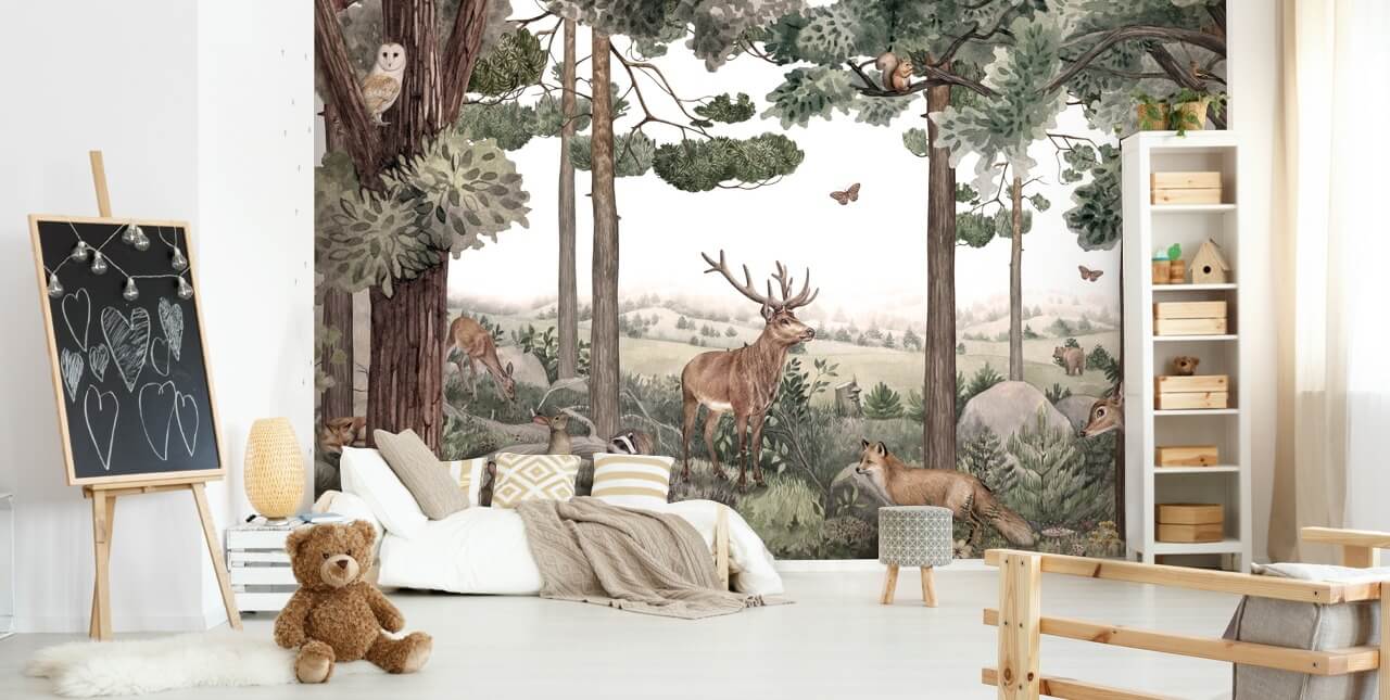 Rakastatko luontoa? Valitse sitten tämä mittatilaustyönä valmistettu Forest Jive -taustakuva Wallsaucesta, jonka on suunnitellut Kikki Belle. Tämä metsäeläintaustakuva on täydellinen lastentarhaan, lasten makuuhuoneeseen tai jopa luonnon inspiroimaan olohuoneeseen. Yhdistä tämä söpö metsätaustakuva luonnonpuuhun, luonnonvalkoisiin ja salvianvihreisiin huonetarvikkeisiin.