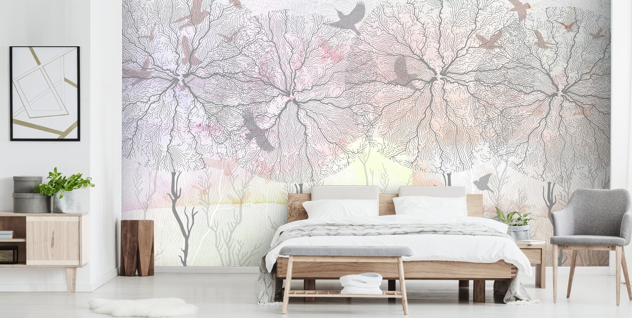Tämä Marina Stupakovan taustakuvamaalaus, jossa on abstrakteja puita ja tyylikkäitä lintuja, lisää mielenkiintoa mihin tahansa huoneeseen!