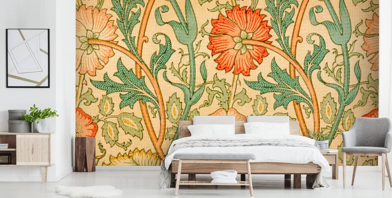 Lämmin, viihtyisä mutta vintage-seinä, valitse tämä Morris Pink and Rose -taustakuvan seinämaalaus Wallsauce.comista. Rakastamme oransseja, keltaisia ja vihreitä sävyjä tässä kauniissa kukkatapetissa, jonka mielestämme näyttäisi täydelliseltä olohuoneessa.