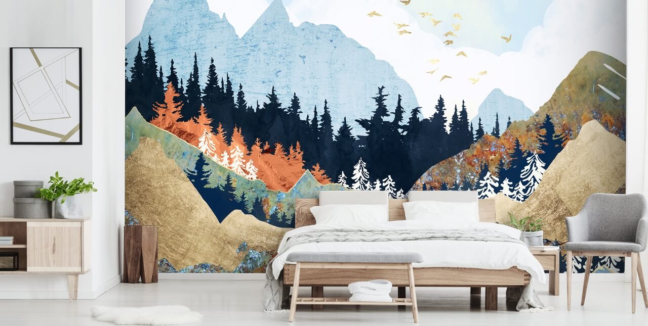 Tässäainutlaatuisessa maisemassa on todella kaunis värivalikoima. Rikkaat laivaston sävyt, taivas blues sekä palaneet oranssit sävyt kontrastia upeasti. Vaikka tämä on kevätteemalla seinämaalaus, värit voivat olla myös syksyisiä, mikä tekee tästä mallista täydellisen vuoden eri osiin.