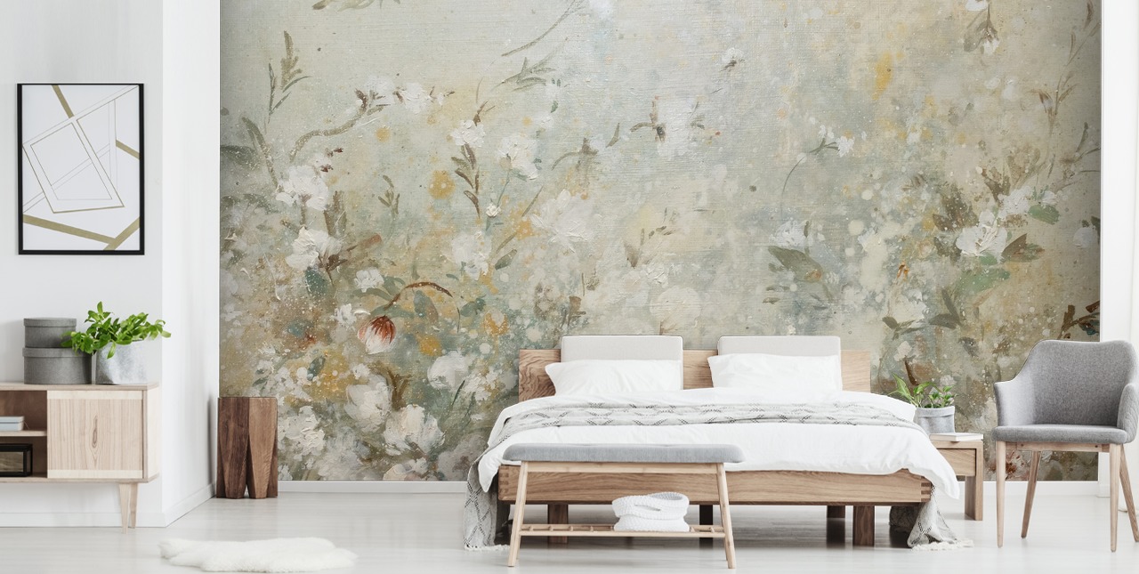 Upea ja elävästi yksityiskohtainen sisustus, Rebeca Lopez Gonzalezin Spring Meadow -seinämaalaus tuo luonnon kauneuden asuintilaasi.