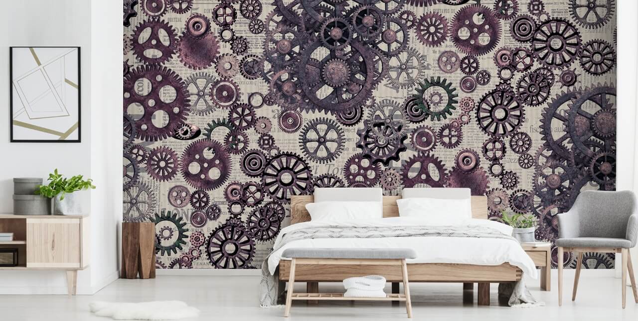 Luo kotiisi hieno ominaisuusseinä tällä Andrea Haasen räätälöidyllä Steampunk Gears -taustakuvalla. Tämä violetti steampunk-taustakuva näyttäisi hämmästyttävältä violetilla maalatuilla ympäröivillä seinillä ja sekoituksella violetteja ja harmaita huonekaluja.