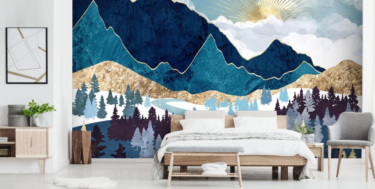Tuotyyli seinillesi tällä upealla Valley Sunrise -seinämaalauksella, jonka on suunnitellut SpaceFrog Design. Mikä upea laivastonsininen ja kultainen taustakuva!