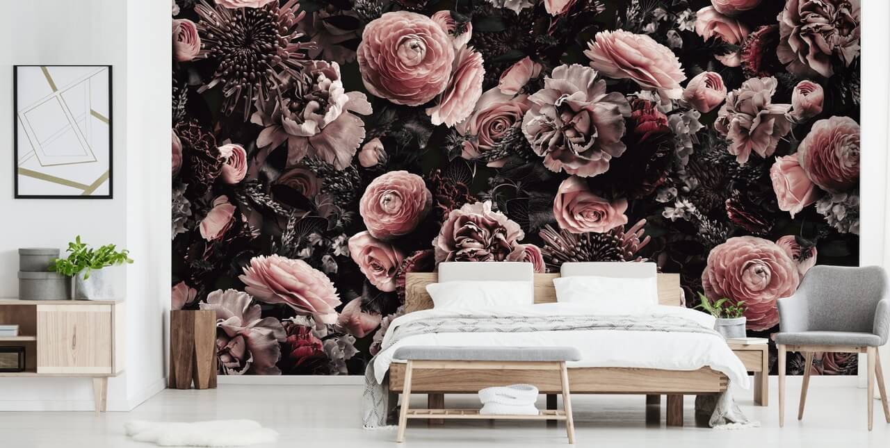 Haluatko parantaa tummaa kukka-taustakuvapeliäsi? Valitse sitten tämä mittatilaustyönä valmistettu Velveteen Flowers Dark Tones -seinämaalaus. Uskomme, että tämä romanttinen kukkatapetti näyttäisi upealta makuuhuoneen seinänä. Maalaa ympäröivät seinät pölypunaiseksi peilaamaan kukkien väriä.