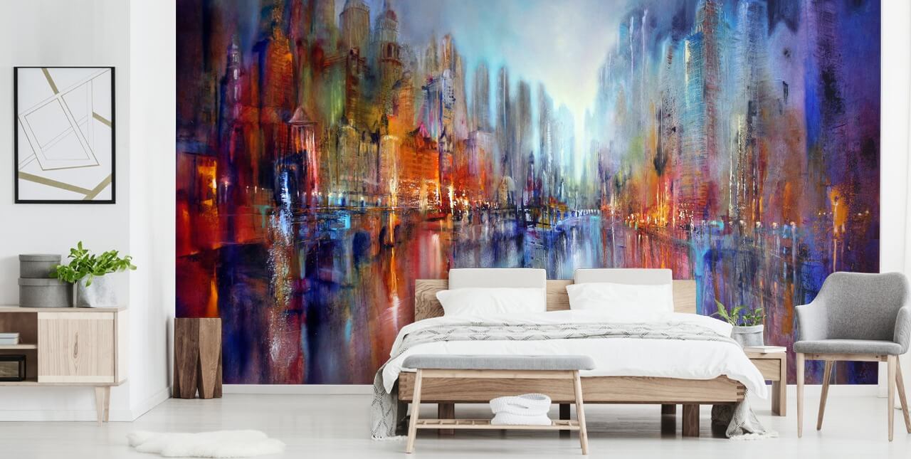 Tulet rakastamaan tätä mittatilaustyönä tehtyä Vibrant City on the River -taustakuvaa, jos rakastat abstraktia kaupunkien maalausta.