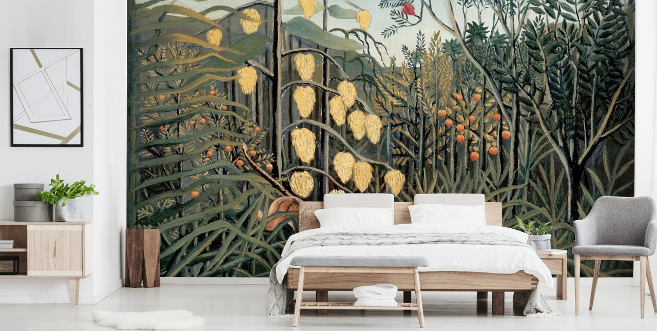 Rakastatko taidetta? Lisää mihin tahansa huoneeseen ajatonta taiteellisuutta Trooppisen metsän taustakuvamaalauksella, jonka on alun perin kirjoittanut taiteilija Henri Rousseau.