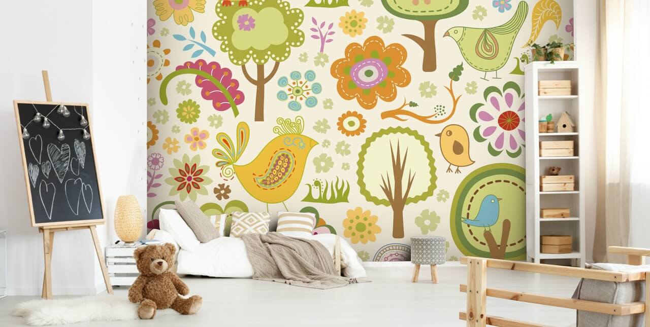 Luosöpö ominaisuusseinä lapsesi makuuhuoneeseen tai lastentarhaan tällä upealla Birds and Forest -taustakuvalla.