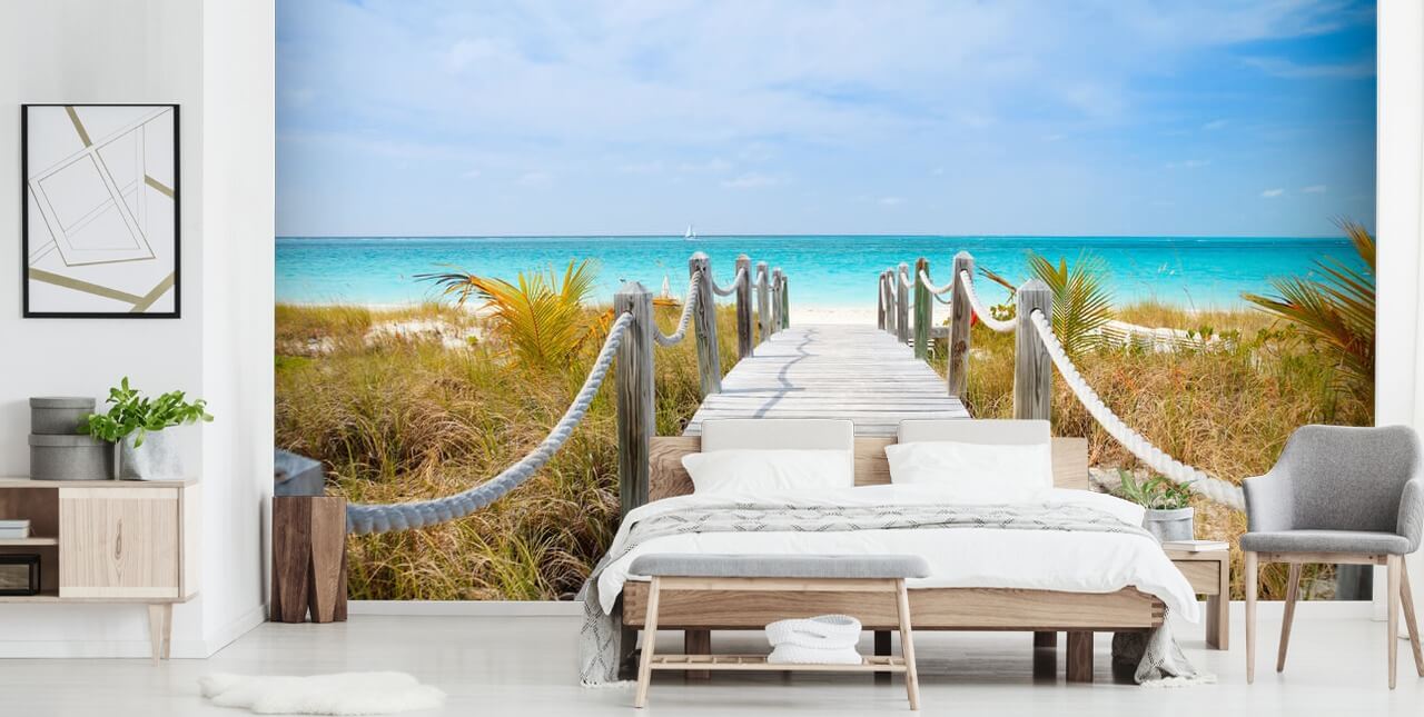 Upea Caribbean Beach Boardwalk Wallsauce -seinämaalaus, tuo auringon ja meren huoneeseesi, kaikki mittatilaustyönä.